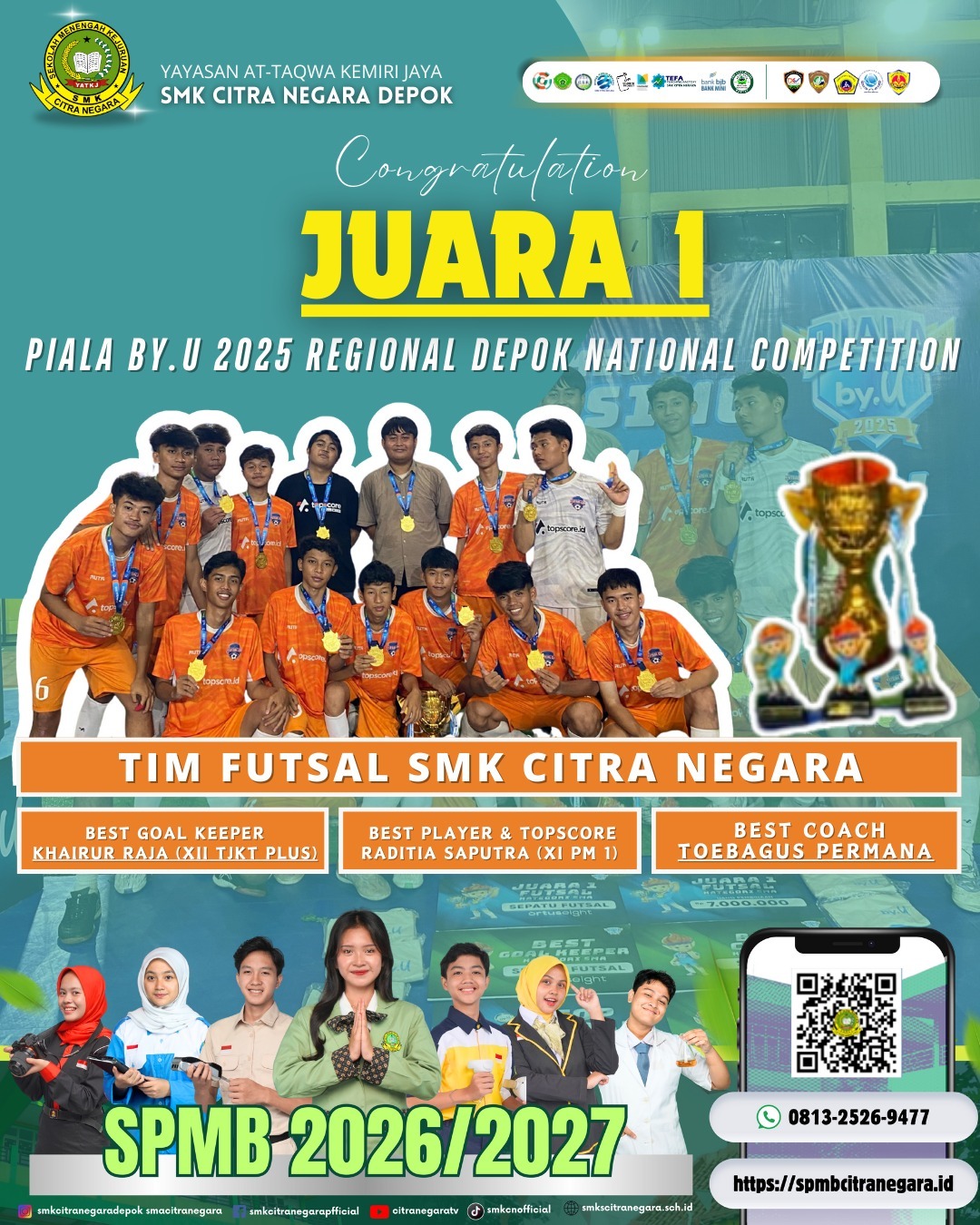 Kepada Tim Futsal SMK Citra Negara atas keberhasilannya meraih JUARA 1 dalam ajang bergengsi Piala by.U 2025 Regional Depok National Competition.